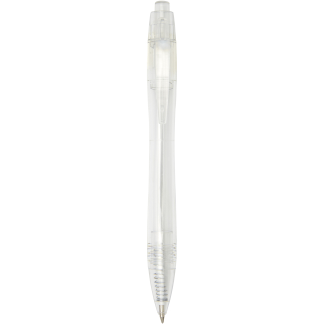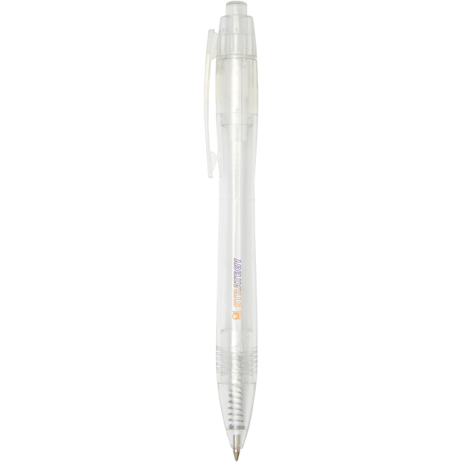 Ballpoint pen with click action mechanism with a transparent barrel. The barrel is made of recycled water bottles, which contributes to decreasing the amount of plastic waste.