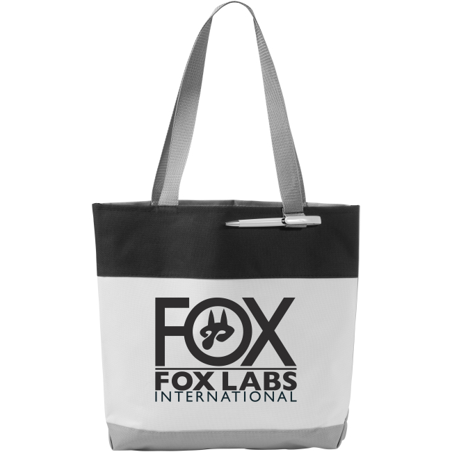 Bloomington colour-block convention tote bag. Fresh budget tote style for tradeshows, conventions, and business meetings features refreshing hues and the popular color dip trend. Open main compartment and pen loop on the front. 27 cm handle drop height. Accessoires not included. 600D Polyester.