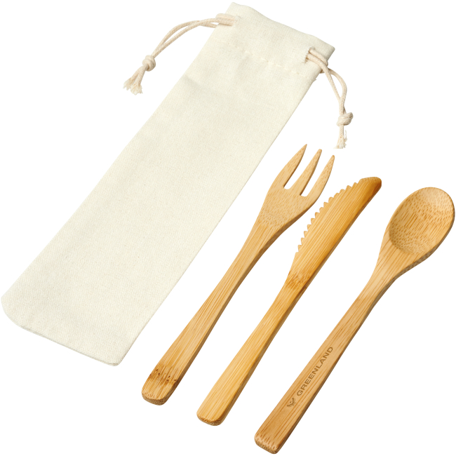 Cutlery set in bamboo comprised of a fork, knife, and spoon. Comes in a non-woven pouch.