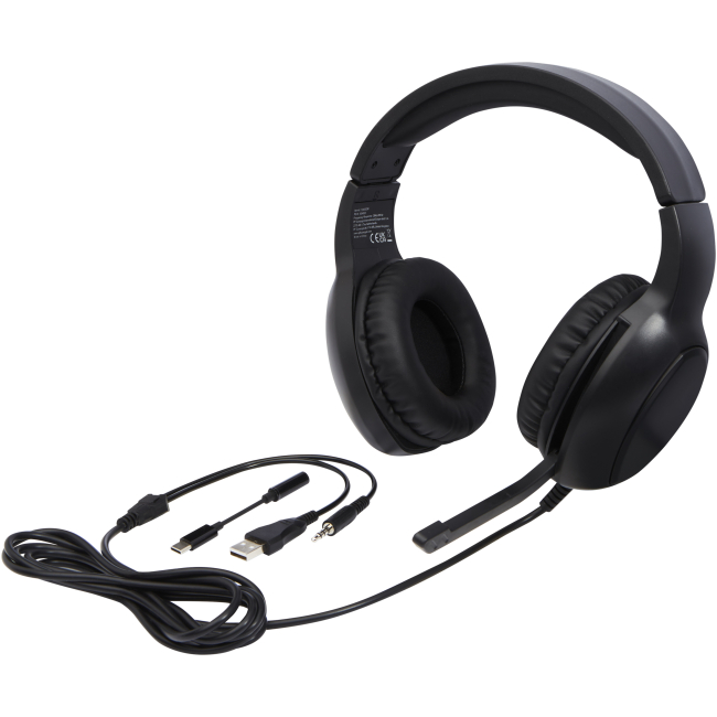 The Gleam gaming headphones delivers high-quality stereo sound with a premium built-in microphone. It includes 2 meters wired cable with a 3.5mm Aux tip and USB-A connector. The 3.5mm Aux input provides audio and microphone when connected to a computer or mobile device. An Aux to Type-C adapter is included for devices with Type-C inputs. With the included adapters and built-in cable, the gaming headphones are compatible with all major PCs, laptops, mobile phones, tablets, PlayStation and Nintendo Switch. Easy to setup without driver requirements. The built-in volume control on the earcups makes it easy to adjust the volume, and the extra padding in the earcups and adjustable headband makes them comfortable to wear. This item can be laser engraved on the earcups to reveal the light-up function. Delivered in a gift box that is made of sustainable material.