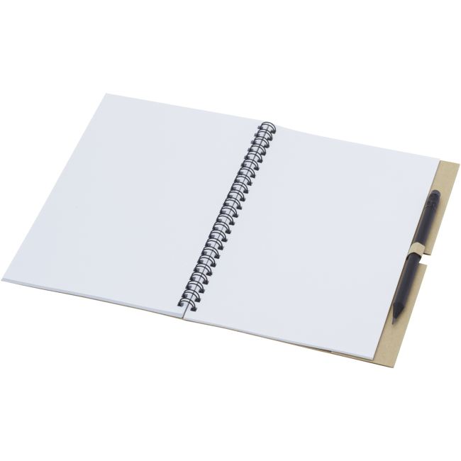 Recycled paper cover wire-o notebook with 40 sheets, 80 g/m² blank FSC recycled paper, and a black pencil. The notebook is made in Italy and the pencil is made in China.
