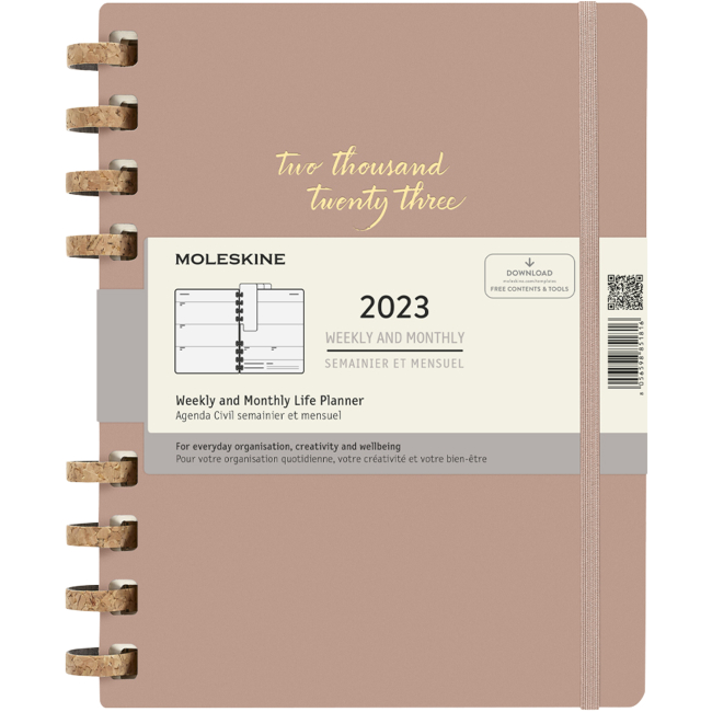 The Moleskine XL planner is a daily buddy for organizing events from January to December 2023. The inside features monthly and weekly spreads for long-term and day-to-day projects. There is also a section to map and track monthly objectives, a password keeper, detachable task lists and pages for note taking and brainstorming. Featuring a hard cover made of innovative Italian crush and remake paper, a flexible and sturdy spiral binding made of cork, ivory-coloured 100 g/m² acid free paper, rounded corners and elastic closure.