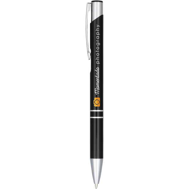 Ballpoint pen with click action mechanism, aluminium barrel, ABS parts, and a steel clip. The pen is available in a wide variety of colours, and has an anodized finish which gives it a stunning shine. The extensive and popular Moneta range is available in many different styles and finishes.