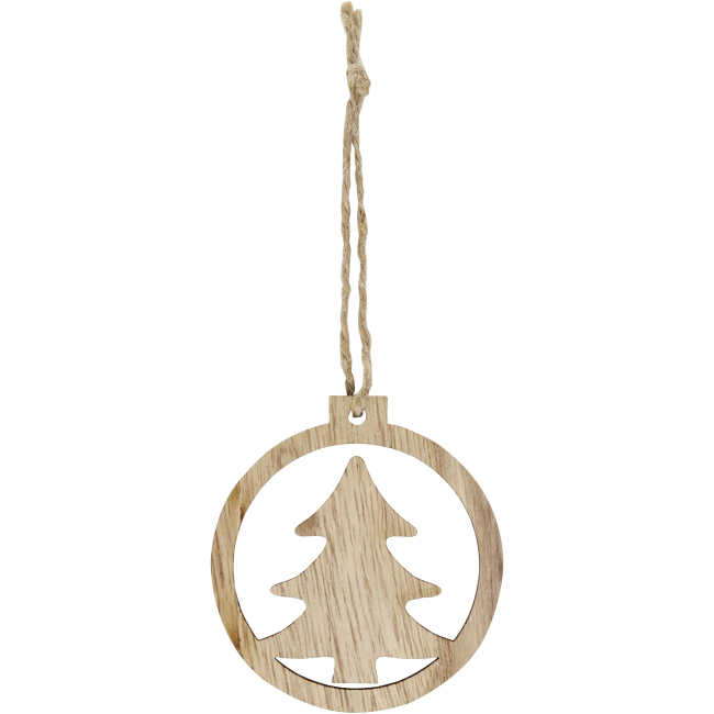 Wooden ornament in round shape with a tree inside. Features a hanger and a cord. Individually packed with a kraft paper card in the back.