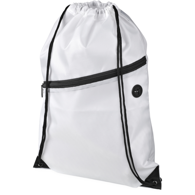 Large main compartment with string closure in black colour. Features a zippered front pocket, an earbud port, and reinforced corner tabs. Resistance up to 5kg weight.