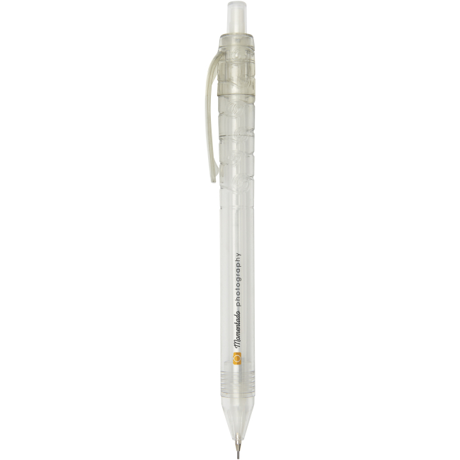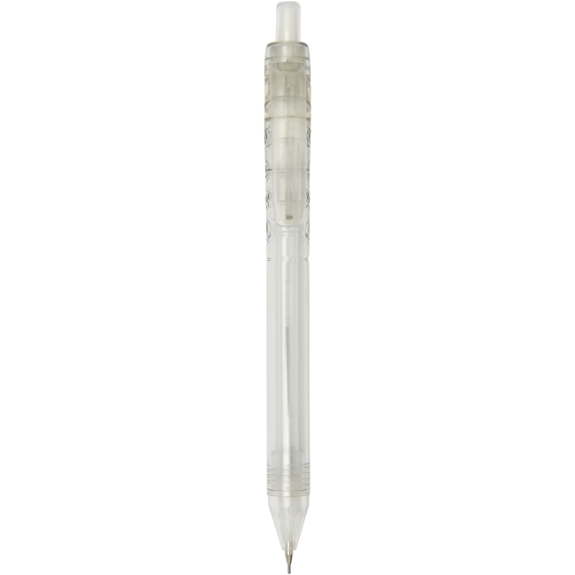 Mechanical pencil with click action mechanism with a transparent barrel. The barrel is made of recycled water bottles, which contributes to decreasing the amount of plastic waste.