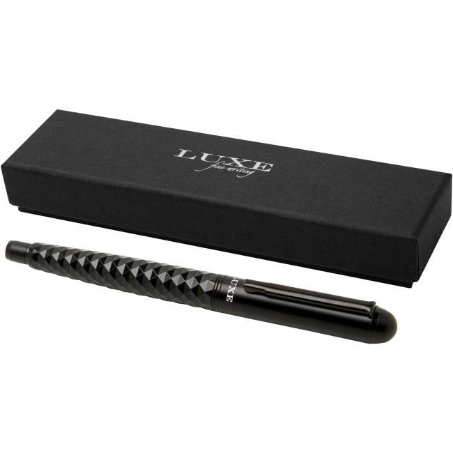 O aspeto elegante e sensação sólida reúnem-se nesta caneta de aparo de design exclusivo. O corpo é complementado com uma pega tátil. Já vem com uma recarga de tinta azul e embalada numa caixa de presente "LUXE". Pode ser combinada como um conjunto de presentes com o estilete ou caneta esferográfica de ação de clique.