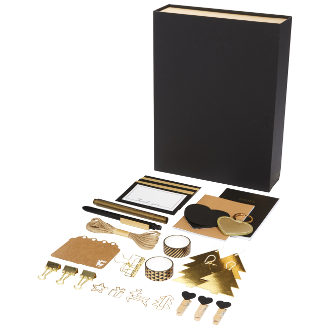 Esta caixa de presente contém 12 artigos de papelaria que vão desde um mini caderno até um conjunto de cartões, etiquetas de nome, clips de papel, caneta esferográfica, marcador dourado, fita washi e muito mais. Cada dia oferece um artigo de papelaria diferente para ser revelado e apreciado ao longo do ano que se avizinha.