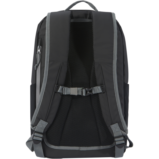 Mochila para portátil impermeável feita de materiais reciclados com certificação GRS, incluindo os fechos de correr. Possui um compartimento acolchoado para portátil de 15" com abertura lateral para acesso rápido, vários bolsos de rede, bolso frontal com fecho de correr e tira reflexiva para visibilidade. O suporte moldado e acolchoado e a alça de peito ajustável tornam confortável o transporte, mesmo quando totalmente carregada. Os materiais reciclados GRS incluem o tecido principal, forro, alças e fechos de correr. Capacidade: 21 litros. Sem PVC.